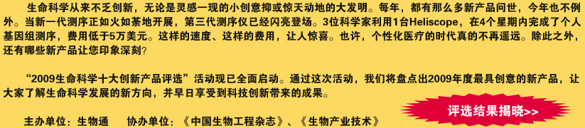 評選細則: 1、評選范圍:2009年在中國上市的儀器、試劑或耗材;產品是原創的,或產品具有突破性的革新;對生命科學領域的發展將起到積極的推動作用。 2、評選方法:生物通編輯部和生命科學領域專家共同篩選出候選產品,采取網絡投票的形式,每位投票者從候選產品中選出10個認為重要的創新產品。 另外,歡迎讀者推薦您心目中的創新產品,請發email至郵箱:phoebe_yu@ebiotrade.com。 3、活動結束后,對成功投票的讀者進行抽獎。您將有機會獲得生物通送出的禮物,包括《生物技術產業》雜志、Promega公司提供的可擦寫磁力冰箱貼以及百泰克公司的花菁染料試用裝。 評選時間:2009年10月15日到2009年12月31日 選結果公布:評選結果將于2010年1月在生物通網站公布