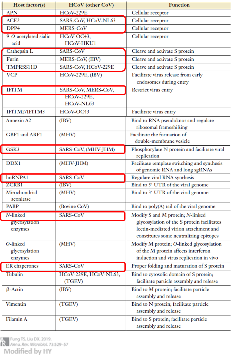 目前無論從時間還是現有的研究進度看,最有希望的就是藥物療法了。針對藥物開發,最好是藥物能特異性識別病毒特有的結構,而對健康宿主細胞中的正常蛋白不要產生影響。但是在不影響大局的情況下,也可以對“自己人”下手,用藥物削弱與病毒勾勾搭搭的自身蛋白,達到抑制病毒擴增的目的。目前已知的冠狀病毒在入侵的7個步驟中都有相應的細胞作為內應為其服務,下面的表格就總結了武漢新冠狀病毒爆發前所有能感染人的冠狀病毒入侵宿主時宿主內的“內奸”蛋白,其中紅框標注的是和強致病病毒相關的宿主蛋白。