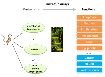 LncRNA是近年來的科研領域最耀眼的明星分子,它廣泛參與各種信號通路,并與癌癥在內的多種疾病密切相關。然而,超過99%的LncRNA的功能和調控機制尚待研究。為了應對這一難題,美國Arraystar公司開發了LncPath™疾病/信號通路特異性LncRNA芯片。LncPath™ 芯片聚焦于與特定的信號通路或疾病相關的LncRNA,通過同時檢測LncRNA及其潛在的靶基因,快速建立LncRNA的調控機制及其與生物學功能之間的聯系(圖1)。