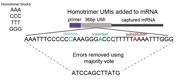 圖1:顯示同源三聚體UMI majority vote錯誤糾正的示意圖。我們用同源三聚體核苷酸塊(由AAA、CCC、GGG、TTT組成的組合)構建了UMIs。通過評估三聚體核苷酸的相似性,通過“majority vote”系統識別和糾正刪除、插入或替代的錯誤,選擇最常見的核苷酸。