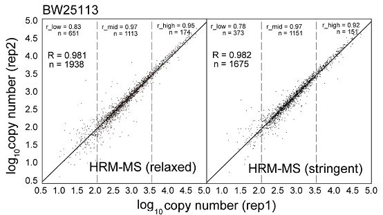 該研究使用了基于“數據非依賴性采集”(DIA)的HRM-MS方案,對大腸桿菌全蛋白質組進行了質譜測定。在兩個不同菌株的全蛋白質組兩次生物學重復測定中,實現了99.7%和99.8%的重現性,距離完美重現僅一步之遙。不僅重現性極高,其蛋白質鑒定數量也創造了大腸桿菌蛋白質組單次鑒定量的世界紀錄。