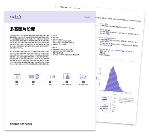 Twist Bioscience 的硅基 DNA 編寫技術(shù)支持大規(guī)模并行生產(chǎn)高質(zhì)量寡核苷酸。利用 Twist 在 DNA 合成方面的規(guī)模效率和出眾表現(xiàn),Twist 多基因片段庫 (MGF)?*為多達(dá)數(shù)十萬個長度在 301 到 500 個堿基對之間的基因片段提供了一種特別的混合形式。在高通量篩選應(yīng)用中,單個片段成本可能是獲得所需數(shù)量變體的一大障礙,然而這種混合片段形式可助力高通量篩選應(yīng)用,如引導(dǎo)編輯、基于超復(fù)雜 CRISPR 的功能篩選、肽和蛋白質(zhì)工程、抗體發(fā)現(xiàn)和大規(guī)模并行報告基因分析 (MPRA)。