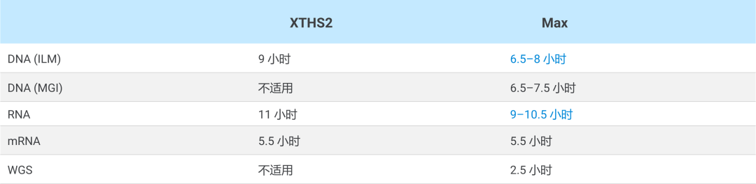 以快速雜交方案為例,無論DNA 還是RNA 手動建庫工作流程,SureSelect Max相比于SureSelect XTHS2的 TAT都縮短 2 小時。這得益于SureSelect Max化學體系的技術升級,包括一步法片段化/末端修復/加A尾、預混的擴增與連接試劑、更少的PCR循環數,更快的磁珠富集等步驟的革新,充分減少了實驗操作者的接觸點、移液操作以及可能的錯誤 ,采用新化學試劑后,酶切建庫工作流程總共可節省 1.5 小時以上(不包括 QC) ,總 TAT 約 6.5–7.5 小時。