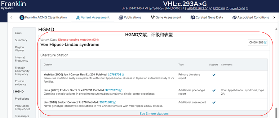 結果展示HGMD收錄文獻證據、HGMD評級和關聯表型信息。