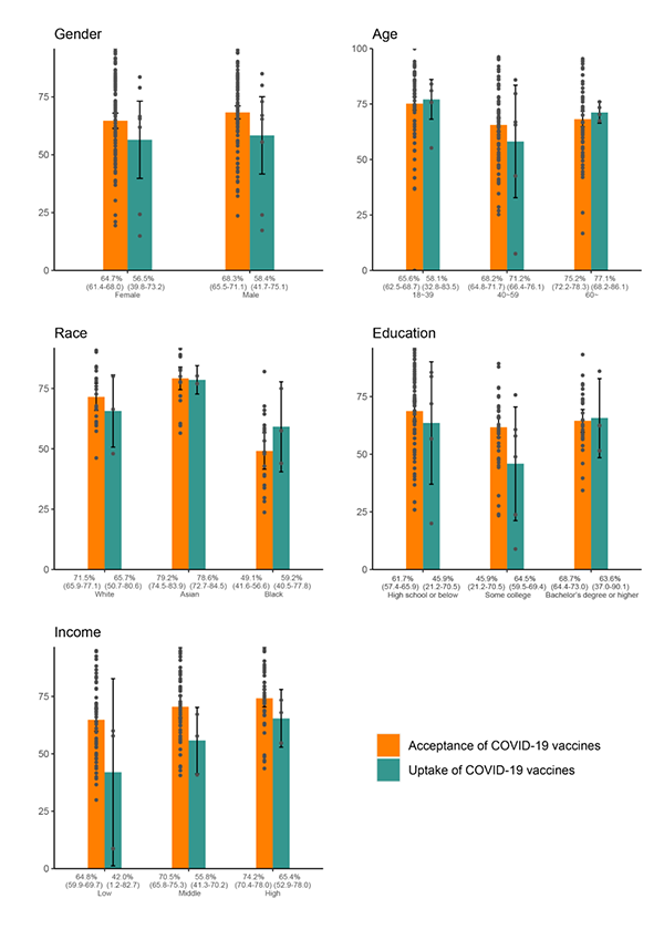 圖3. 成人亞組之間新冠疫苗接受度和接種率的比較