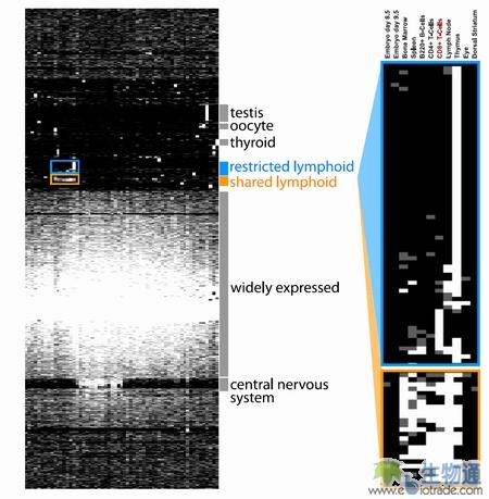下圖中Ken C. Pang及其同事利用lncRNA芯片比較61種不同的小鼠組織中lncRNA的表達譜數據,利用聚類分析,鑒定出了3357種lncRNA在其中表達。利用聚類分析,他們鑒定出了在淋巴細胞以及其他組織中特異表達的lncRNA,為進一步研究特定組織中表達的lncRNA提供了思路(Ken C. Pang, et al. J IMMUNOL. 2009)。