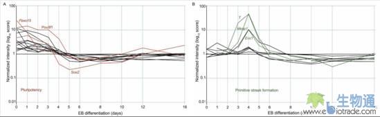 下圖是Marcel E. Dinger及其同事利用lncRNA芯片分析在小鼠胚胎肝細胞分化過程中,利用多能性標記基因(Pou5f1, Sox2等,圖A)以及原條(Primitive streak)形成過程的標記基因(T, Mesp1, Evx1,圖B)篩選與其表達水平變化顯著相關的lncRNA,進而得到和這兩個過程密切相關的lncRNA,為進一步探究相關lncRNA的功能提供了思路(Marcel E. Dinger, et al. Genome Research. 2008)。