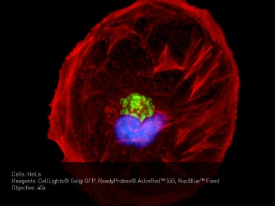試劑:CellLight®Golgi GFP(綠色)、ReadyProbes® ActinRed 555(紅色)、NucBlue® Fixed(藍(lán)色)