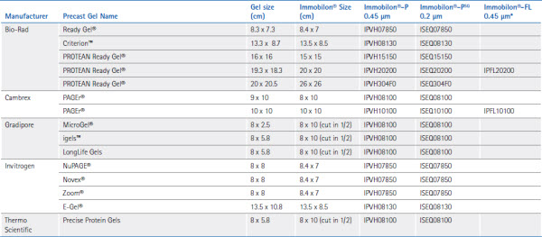 表4. Immobilon® PVDF預切轉(zhuǎn)印膜和匹配的預制膠。