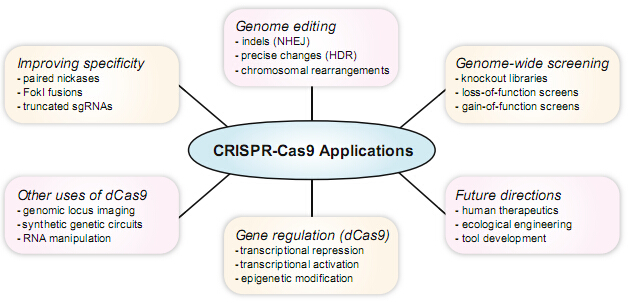 用CRISPR-Cas9對模式生物進行基因組編輯已經常規化了,人們又發現了一些更有趣的應用。舉例來說,同時表達Cas9和多種sgRNA可以實現多重化靶標。除了同時編輯多個染色體位點以外,CRISPR-Cas9還可以刪除染色體大片段,這需要兩個sgRNA在目標區域兩側誘導DSB。此外,CRISPR-Cas9還可以模擬腫瘤中發生的大規模的染色體重排。