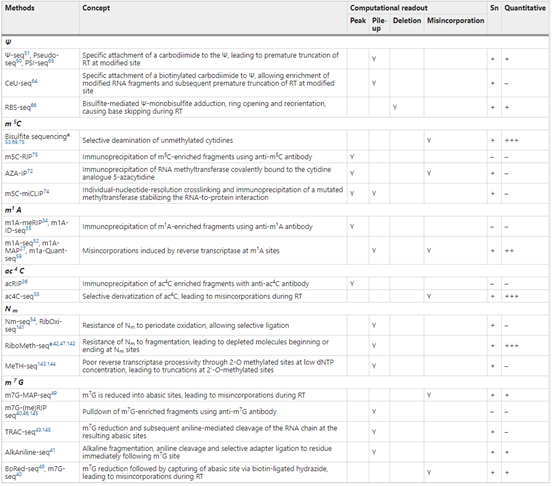 因此,對于絕大多數非 m6A 表觀轉錄組,已經開發出利用修飾堿基的獨特化學性質使它們在逆轉錄后可見的方法。這是通過不同的策略實現的,例如,通過改變修飾堿基身份的修飾特異性化學物質或通過將大量殘基特定連接到修飾堿基上導致逆轉錄過程中過早截斷(見下表)。這些實驗方案通常會導致修改位點的錯配或缺失,或者導致讀取的“堆積”,這些讀取選擇性地在特定位置開始或結束,然后可以從中推斷出修改的存在。此類化學基因組學方法的主要優勢在于其出色的、通常為單核苷酸的分辨率,以及它們能夠提供修飾水平的相對定量,有時甚至是絕對定量[1]