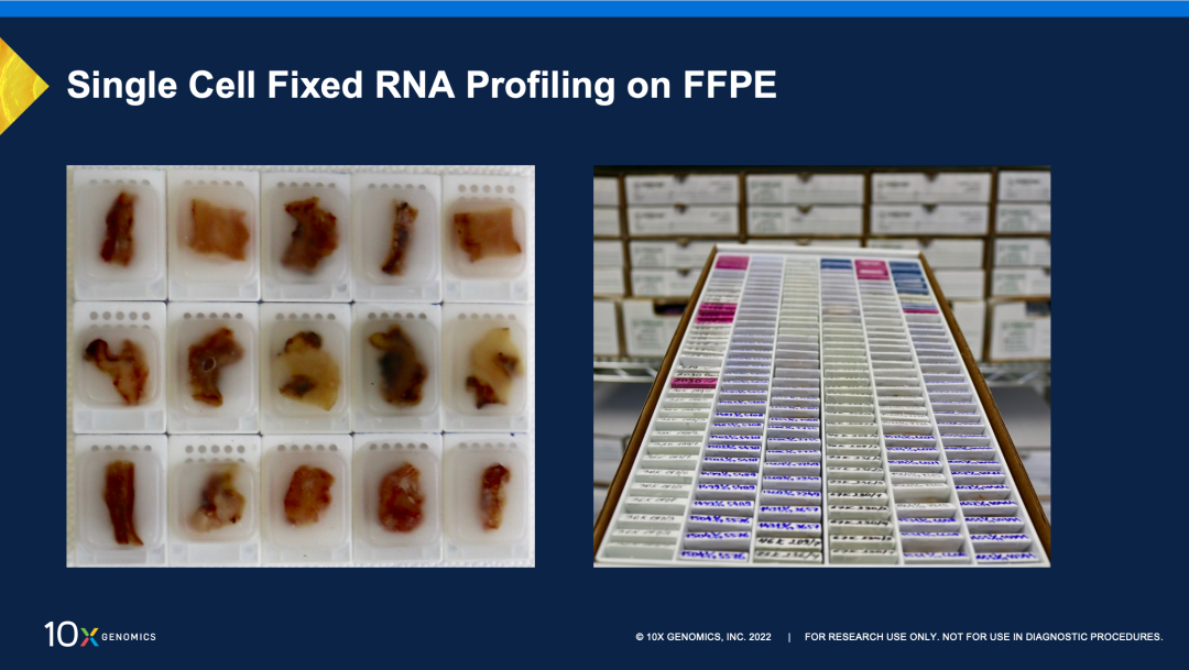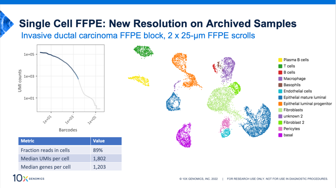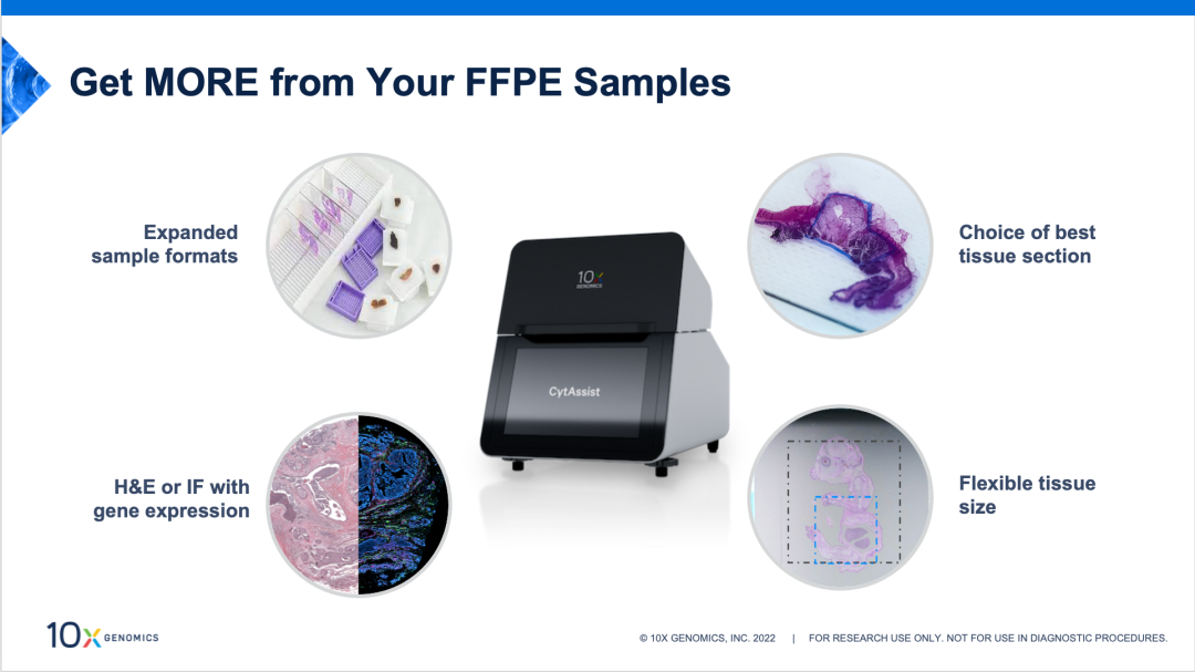 在今年剛剛結(jié)束的AGBT大會上,10x Genomics首次宣布了在單細胞及空間維度針對FFPE樣本的全新解決方案,同時也成為目前市面上首家有望同時提供商品化的單細胞及空間FFPE解決方案的廠家。