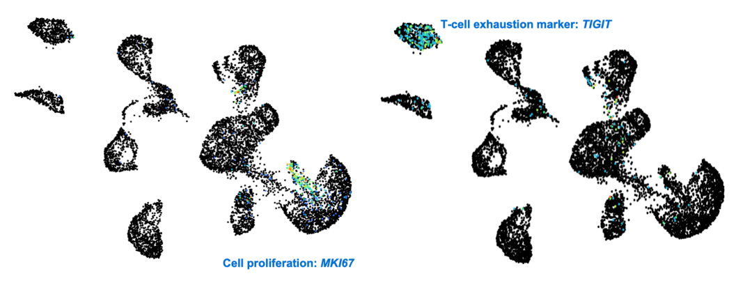 通過標志基因的表達情況,還能夠看到細胞增殖以及耗竭性T細胞