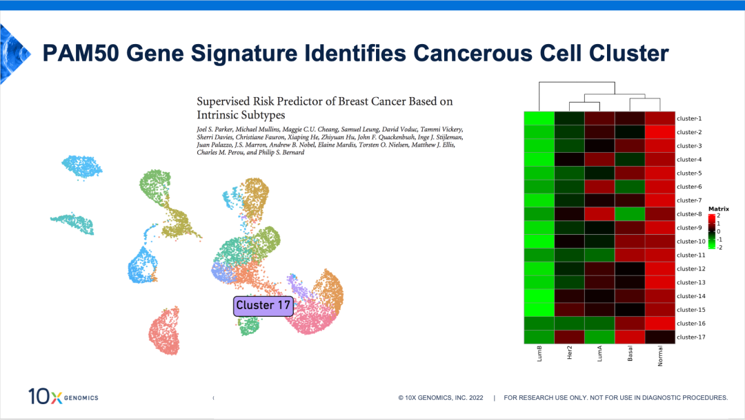 浸潤性導(dǎo)管癌是乳腺癌最常見的病理類型。乳腺癌是由多種異型性病變組成的一大類疾病的集合體,雖然都命名為乳腺癌,但這些病變的異常分子、癌細胞構(gòu)成以及臨床轉(zhuǎn)歸都各不相同,因此使乳腺癌的腫瘤分類更顯特別。經(jīng)過不斷的改進及演變,目前多基因預(yù)測成為了乳腺癌分型的一個新途徑,但傳統(tǒng)方法通常是基于bulk水平根據(jù)基因特征(gene signature)對癌癥進行分類。現(xiàn)在有了單細胞FFPE解決方案,我們可以將基因特征應(yīng)用于該數(shù)據(jù)集中的每種細胞簇,下圖展示了將每個細胞簇與PAM50基因特征相關(guān)聯(lián)。