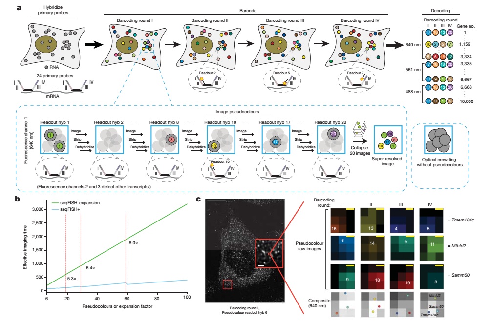 使用seqFISH,轉錄本可以通過建立在多個圖像上的熒光條形碼來識別。這一系列的熒光信號唯一地識別基因,并允許數百到數千個基因被有效地區分。seqFISH也適用于研究DNA的核結構,并可與序列免疫熒光相結合用于蛋白質檢測。