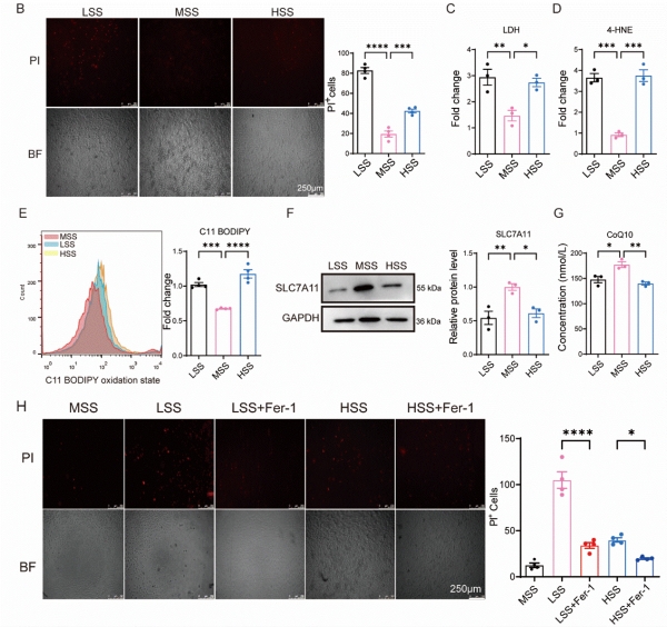 KLF6是感知血流異常的“哨兵”。血管內皮細胞時刻承受著血液流動產生的剪切力。生理范圍內的層流剪切力對血管具有保護作用,而動脈分叉、彎曲處常見的低剪切力或振蕩剪切力則是動脈粥樣硬化(AS)的高危因素。本研究通過構建體外微流控系統,對人血管內皮細胞施加高、低及生理剪切力刺激。令人意外的是,研究發現不僅低剪切力(LSS),過高剪切力(HSS)同樣會導致內皮細胞損傷。這兩種“異常”剪切力均顯著降低了細胞內KLF6的表達水平,并導致了細胞死亡。通過使用鐵死亡特異性抑制劑(Fer-1)進行干預,證實這種由異常剪切力誘導的鐵死亡是可逆的 (圖2)。