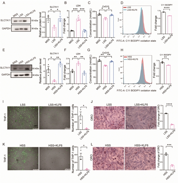 為了模擬更接近體內的病理環境,研究人員還構建了包含血管平滑肌細胞和單核細胞的共培養模型。結果表明,在低剪切力條件下,過表達KLF6不僅能減少內皮細胞的脂質過氧化,還能顯著降低單核細胞的黏附以及脂質在血管壁的積聚 (圖4)。該研究首次系統性地證明了KLF6是連接血流動力學異常與內皮細胞鐵死亡的關鍵分子節點。這一成果不僅解釋了為何血管分叉處(血流紊亂區)容易發生動脈粥樣硬化,更為通過靶向KLF6或鐵死亡通路來防治心腦血管疾病提供了全新的理論依據和潛在治療靶點。