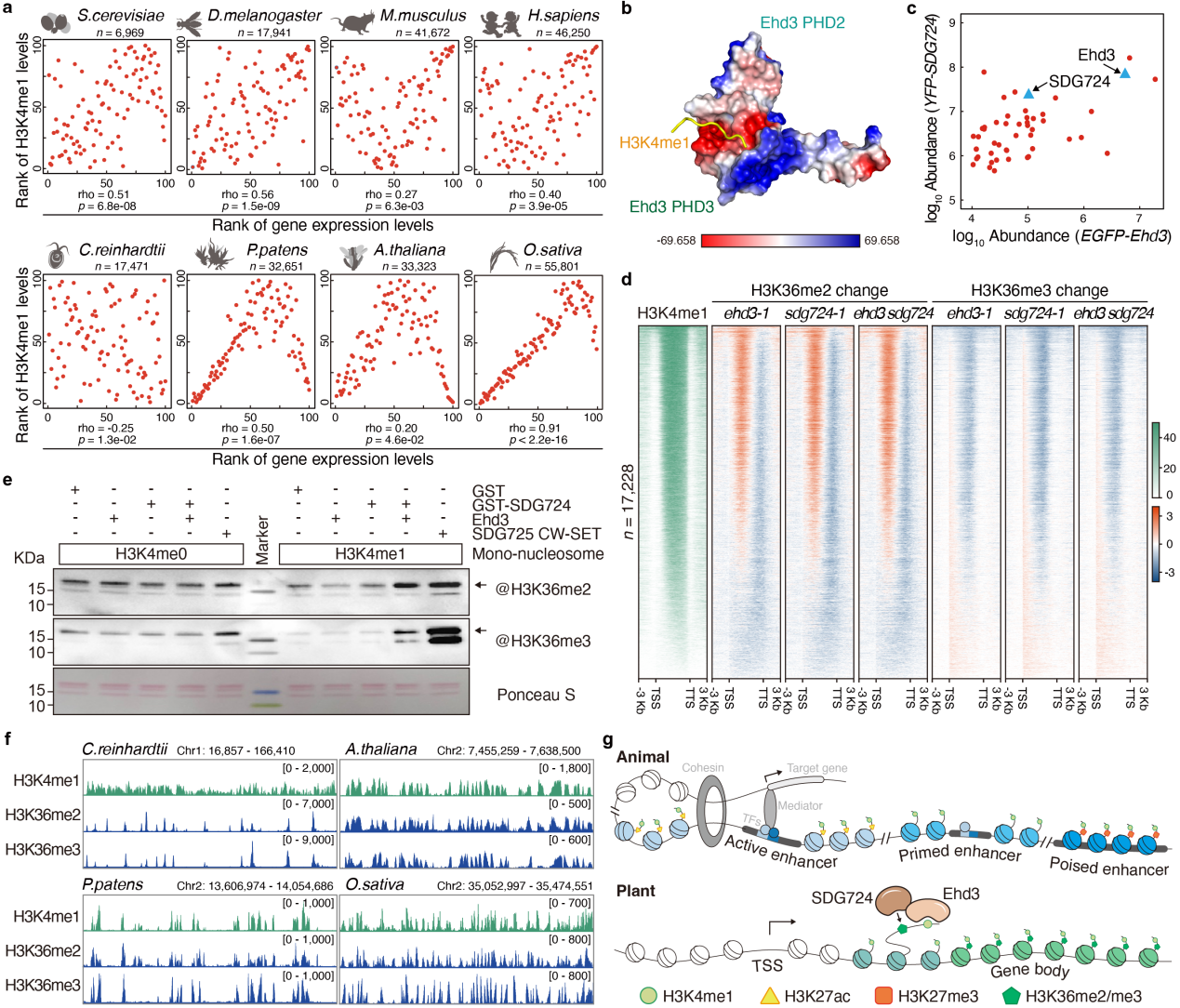 a.陸生植物中H3K4me1與基因表達呈現(xiàn)出獨特的相關(guān)性; b. Ehd3串聯(lián)PHD結(jié)構(gòu)域識別H3K4me1肽段的晶體結(jié)構(gòu);c. Ehd3與H3K36甲基轉(zhuǎn)移酶SDG724存在相互作用; d.Ehd3或SDG724缺失導(dǎo)致H3K36me2/me3的分布模式發(fā)生全局變化; e.酶活實驗證實SDG724的甲基轉(zhuǎn)移酶活性依賴于Ehd3和H3K4me1; f. 陸生植物中H3K4me1與H3K36me2/me3共定位; g. H3K4me1在動、植物中具有不同的功能。