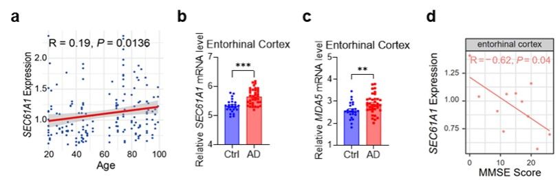 研究人員發(fā)現(xiàn),在自然衰老小鼠的皮層組織及AD患者皮層組織中,SEC61A1及dsRNA感受器的表達(dá)水平均顯著上調(diào)。通過對AD患者現(xiàn)有RNA測序數(shù)據(jù)的分析,SEC61A1的表達(dá)量與簡易精神狀態(tài)檢查(MMSE)評分呈顯著負(fù)相關(guān),提示SEC61A1的高表達(dá)可能是AD患者認(rèn)知功能下降的促進(jìn)因素之一。