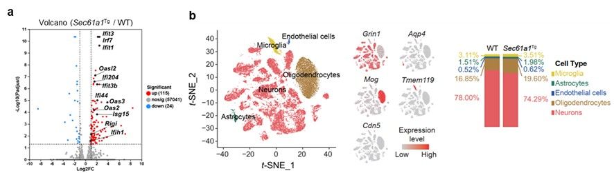 為驗證這一假設(shè),研究人員在小鼠大腦神經(jīng)元中特異性過表達(dá)SEC61A1,成功模擬了衰老及AD相關(guān)的關(guān)鍵病理表型。分子層面檢測再次證實,SEC61A1過表達(dá)激活了mt-dsRNA介導(dǎo)的天然免疫通路,誘發(fā)顯著的神經(jīng)炎癥,并導(dǎo)致認(rèn)知功能損傷。轉(zhuǎn)錄組與單細(xì)胞核測序進(jìn)一步揭示,神經(jīng)元特異性過表達(dá)SEC61A1后,神經(jīng)炎癥信號顯著增強(qiáng),神經(jīng)元數(shù)量明顯減少,且在神經(jīng)元特異性上調(diào)基因中富集了多種神經(jīng)退行性疾病相關(guān)通路。