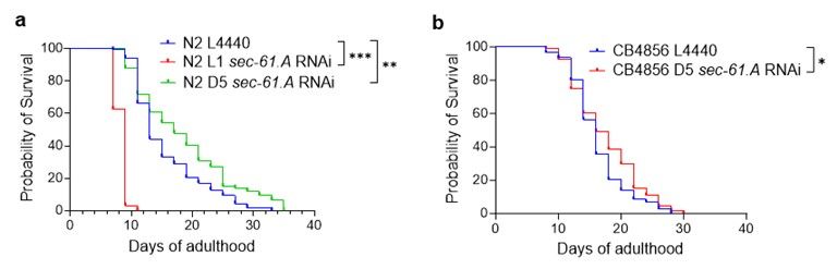 圖6. 成年線蟲中敲低sec-61.A顯著延長線蟲壽命
