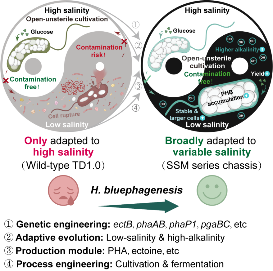 陳國強教授團隊才從野生環境中分離得到耐鹽堿的嗜鹽菌(Halomonas spp.)天然菌株,開展了二十年余年系統攻關,成功創制出具有完全自主知識產權的新型底盤細胞——Halomonas bluephagenesis TD系列及其衍生菌株,實現在開放條件下連續發酵,徹底規避滅菌環節,顯著降低能耗與設備成本,在國際上首次提出并建立了基于極端微生物的下一代工業生物技術(NGIB)。然而,嗜鹽菌底盤依賴較高鹽度(通常30-60 g/L NaCl)以維持細胞生理穩態與代謝活性。這一高鹽依賴在一定程度上限制了其在更低鹽、更靈活工藝體系中的應用拓展,也增加了后續廢水處理與環境負荷。如何在保持開放非無菌培養優勢的同時,降低嗜鹽菌對高鹽環境的依賴,從而構建更節能、更低碳、更普適的國產自主生物制造平臺,是該領域亟需突破的核心科學問題。