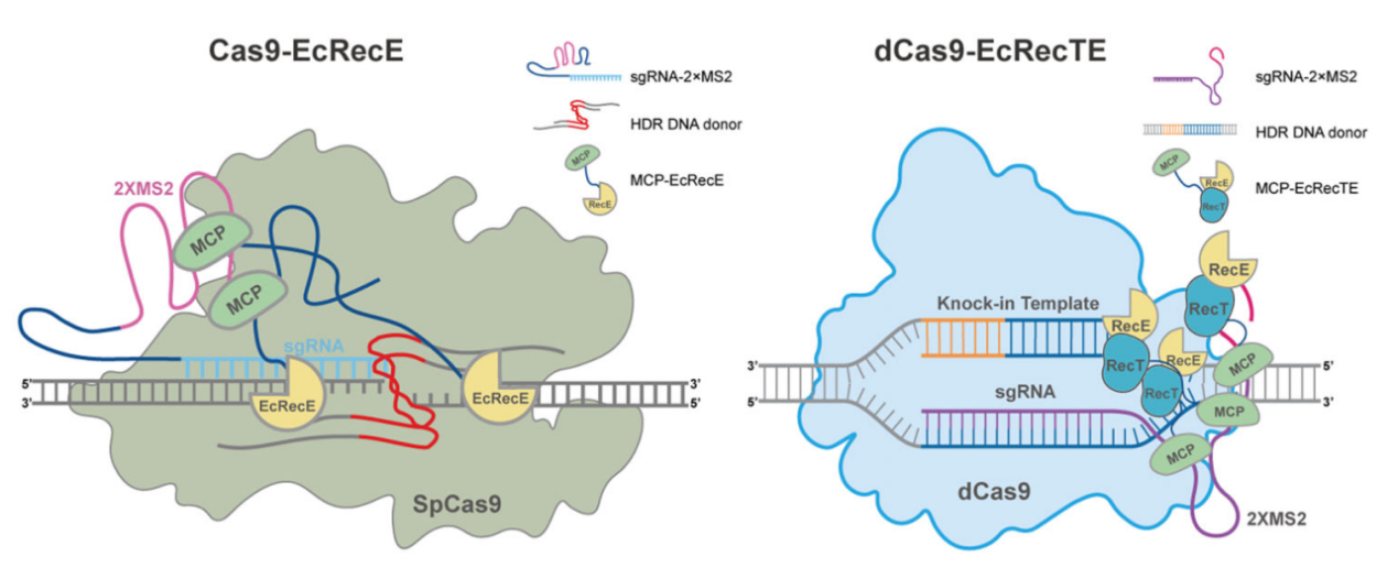 在該項(xiàng)研究中,作者篩選到EcRecE可作為一種高效的HDR增強(qiáng)因子,評(píng)估了Cas9/EcRecE偶聯(lián)系統(tǒng)在不同細(xì)胞系和原代細(xì)胞中的HDR增強(qiáng)能力,并對(duì)該系統(tǒng)進(jìn)行了進(jìn)一步優(yōu)化和安全性評(píng)估。結(jié)果顯示:EcRecE可將各類細(xì)胞中的HDR效率提高2-4倍,并且與單獨(dú)使用Cas9相比具有更高的精準(zhǔn)性。作者隨后結(jié)合蛋白質(zhì)工程獲得了尺寸最短但效率最高的RecE變體。結(jié)合課題組之前開發(fā)的REDIT和dCas9-SSAP技術(shù)(Wang et al., 2021,Nucleic Acids Research; Wang et al., 2022, Nature cell biology),作者將截短的RecE與RecT融合,分別構(gòu)建了Cas9-miniRecE/T、Cas9n-miniRecE/T和dCas9-miniRecE/T系統(tǒng)。結(jié)果表明,這些系統(tǒng)均可在細(xì)胞中實(shí)現(xiàn)高效大片段基因敲入。其中,dCas9-miniRecE/T系統(tǒng)能夠在不形成DNA單鏈/雙鏈斷裂的條件下實(shí)現(xiàn)高于野生型Cas9的基因敲入效率,這對(duì)于精準(zhǔn)基因治療具有重要意義。最后,作者將miniRecE/T系統(tǒng)應(yīng)用于人類胚胎干細(xì)胞和小鼠原代神經(jīng)元。另外,由于miniRecE/T尺寸很小,作者將其與Cas9一起包裝到腺病毒,并在多個(gè)細(xì)胞內(nèi)源性位點(diǎn)實(shí)現(xiàn)高效大片段DNA敲入。