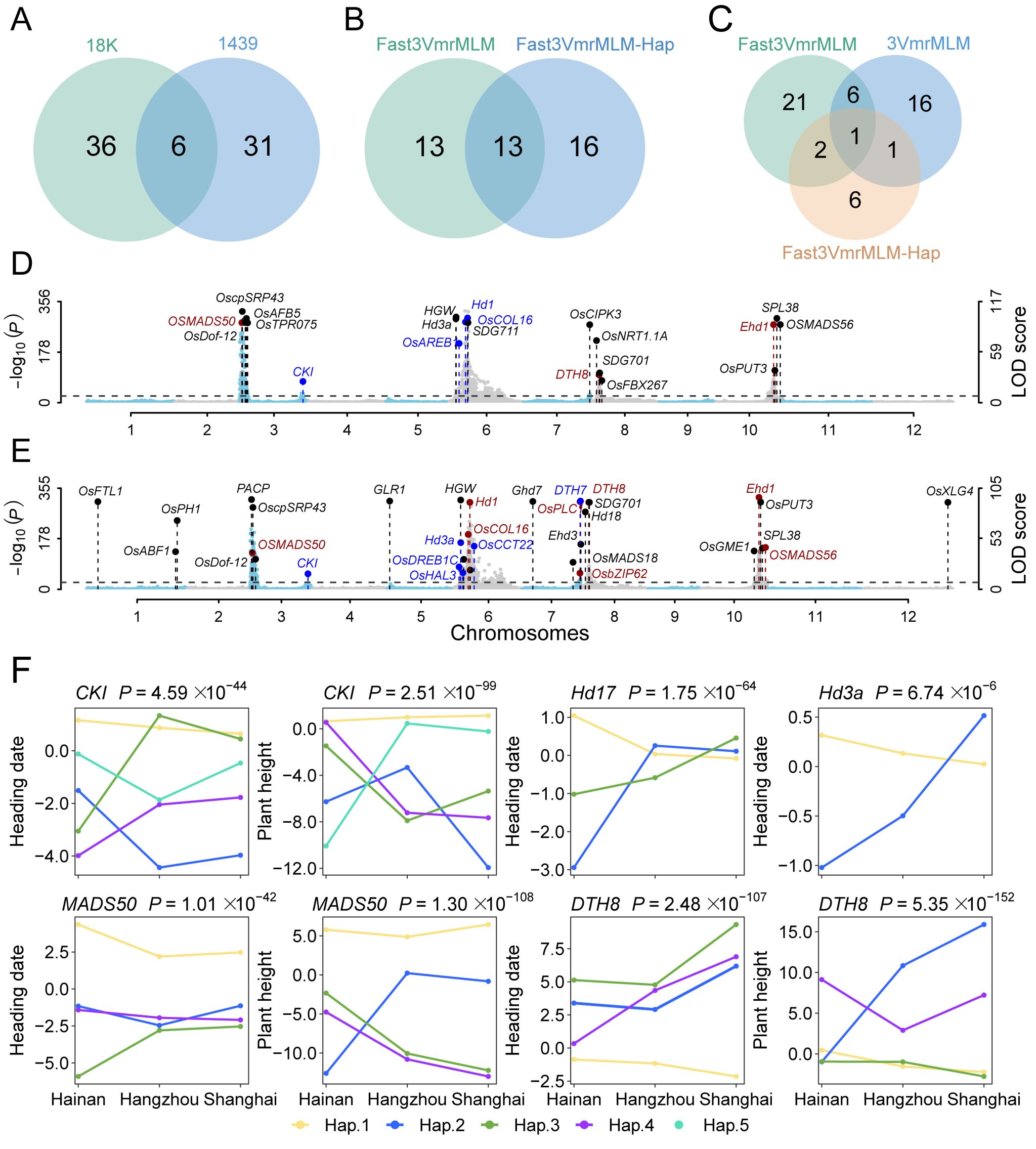 在統(tǒng)計建模層面,研究團隊構(gòu)建了包含環(huán)境效應(yīng)、基因加性(a)和顯性(d)效應(yīng)、GEI的加性×環(huán)境(ae)和顯性×環(huán)境(de)的互作效應(yīng)及其a、d、ae和de多基因背景的壓縮方差組分混合線性全模型。在分析框架方面,新方法延續(xù)并拓展了此前提出的“全基因組掃描+機器學習”框架,借助機器學習在縮減的多位點模型中檢測QTNs和QEIs的優(yōu)勢,有效突破了傳統(tǒng)GWAS在識別顯性、小效應(yīng)及稀有變異方面的“視野盲區(qū)”。在模擬數(shù)據(jù)集II中,F(xiàn)ast3VmrMLM的QTN和QEI檢測平均功效高達87.75%,假陽性率僅為0.3?,顯著優(yōu)于傳統(tǒng)方法的2.40%–72.75%的平均功效和0.16?–54.68?的假陽性率(圖1)。在1,439水稻、18K水稻和G2F玉米數(shù)據(jù)重新分析中,新方法分別挖掘42、37和10個經(jīng)分子生物學實驗證實的已知GEIs(圖2和圖3),充分驗證了其有效性。