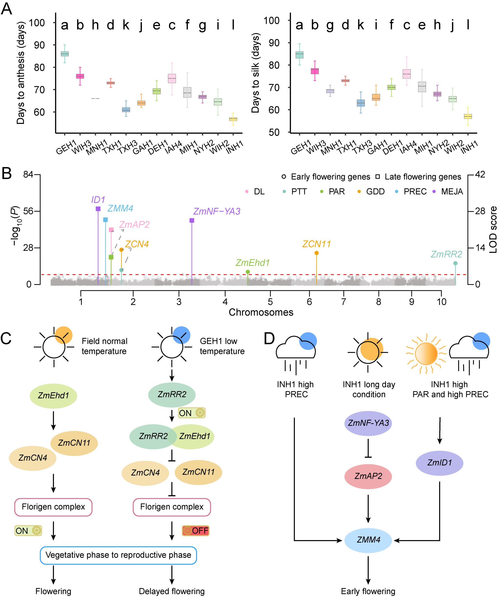 作物在不同環(huán)境中表現(xiàn)出顯著的表型可塑性,其本質(zhì)是基因?qū)Νh(huán)境和氣象因素的響應(yīng)。圍繞玉米開花期這一重要性狀(圖3A),本研究整合了來自12個環(huán)境的1,140份玉米自交系開花表型、437,214個SNP標記基因型和相應(yīng)時空的氣象數(shù)據(jù),利用Fast3VmrMLM和Fast3VmrMLM-Hap方法,從多環(huán)境性狀表型“直接”、性狀對氣象因素的回歸參數(shù)“間接”兩個層面系統(tǒng)挖掘GEIs(圖3B),揭示不同地區(qū)玉米開花早晚差異的遺傳×環(huán)境互作的遺傳基礎(chǔ)。