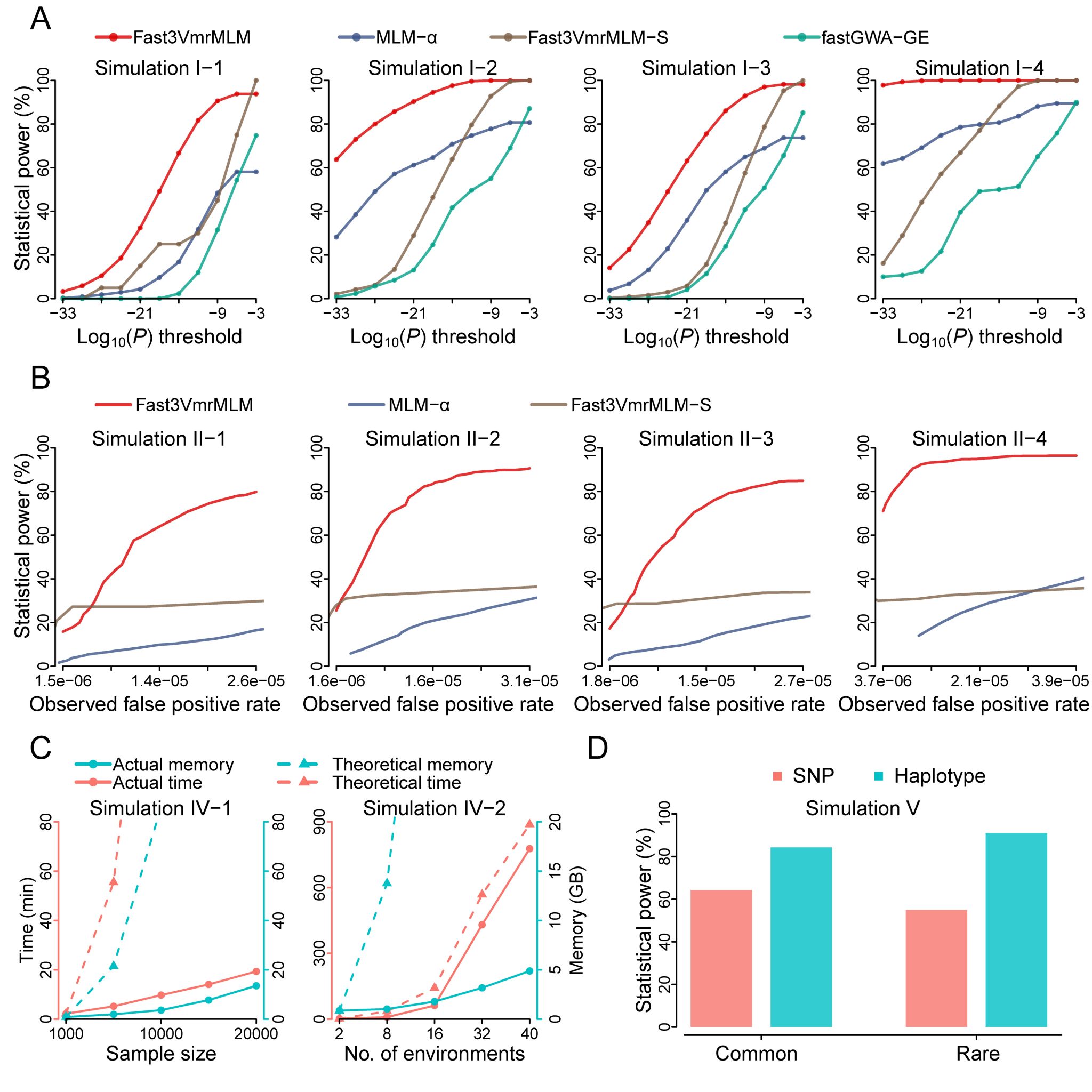 針對多年多點作物大群體數(shù)量性狀表型、氣象大數(shù)據(jù)和海量基因組信息帶來的計算挑戰(zhàn),F(xiàn)ast3VmrMLM系統(tǒng)整合了八項先進的統(tǒng)計與計算技術(shù),實現(xiàn)了高效、快速、大樣本和低計算資源消耗的關(guān)聯(lián)分析Fast3VmrMLM方法。新方法分析1,439水稻數(shù)據(jù)集的運行時間較原3VmrMLM方法縮短近50倍;在60線程和1TB內(nèi)存的小型服務(wù)器上,成功完成了3VmrMLM、FarmCPU和EMMAX等現(xiàn)有方法無法實現(xiàn)的18K水稻和玉米G2F數(shù)據(jù)集分析。在Monte Carlo模擬研究中,新方法聯(lián)合分析20,000個品種100萬個標記和兩個環(huán)境表型數(shù)據(jù)集僅需19.33分鐘,內(nèi)存占用13.51GB;1,000個品種100萬個標記和40個環(huán)境表型數(shù)據(jù)集,耗時777.48分鐘,內(nèi)存占用4.88GB;20,000個品種100萬標記和20個環(huán)境表型數(shù)據(jù)集,耗時48.01小時,占用22.70GB內(nèi)存,使大數(shù)據(jù)遺傳分析在小型計算設(shè)備上運行成為可能,突破了大數(shù)據(jù)的“算力壁壘”,為小團隊分析大數(shù)據(jù)提供方法學平臺。