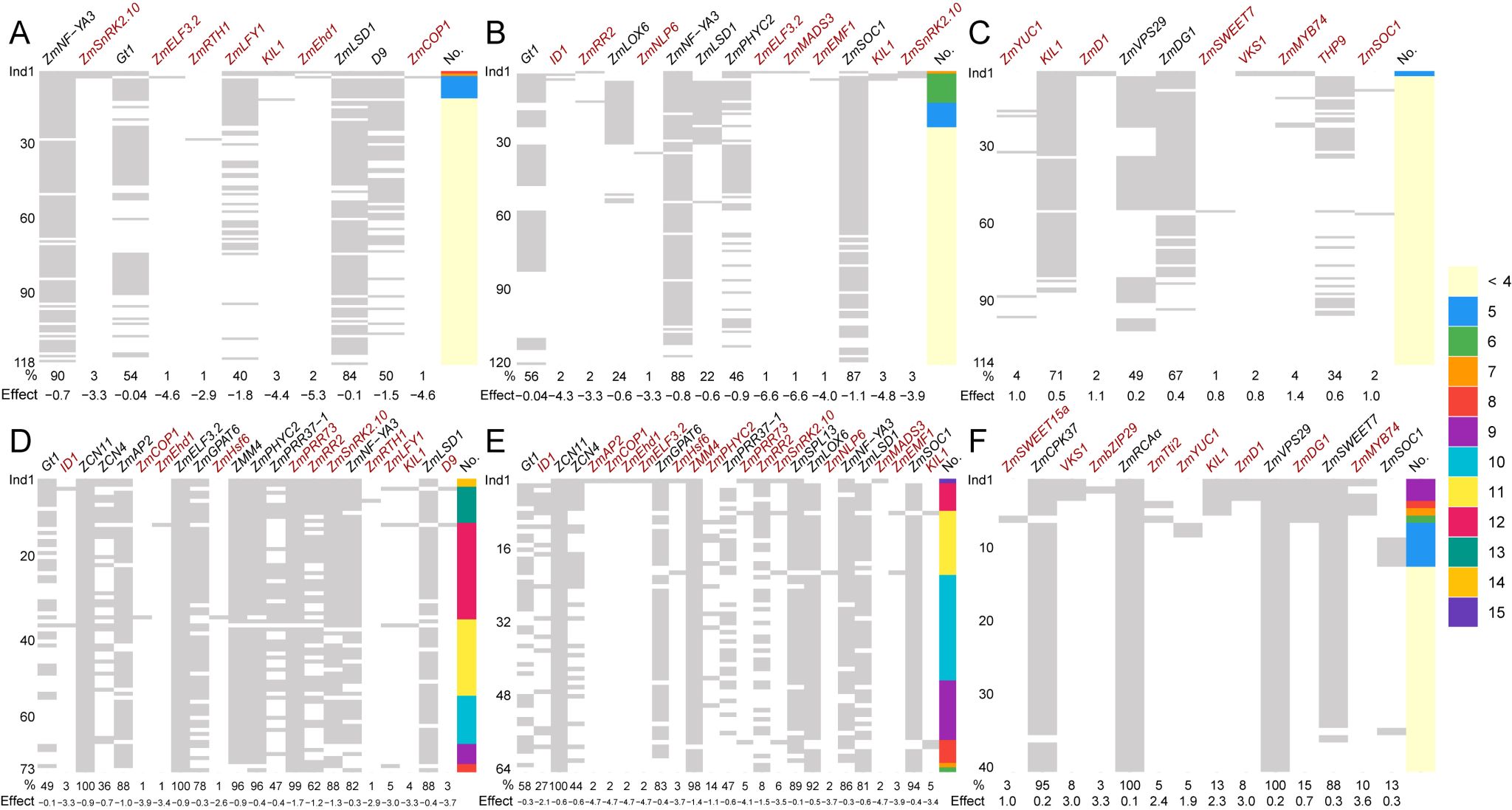 圖4 早花和高產(chǎn)玉米種質(zhì)前10%的已知基因和GEIs的優(yōu)異單倍型分布