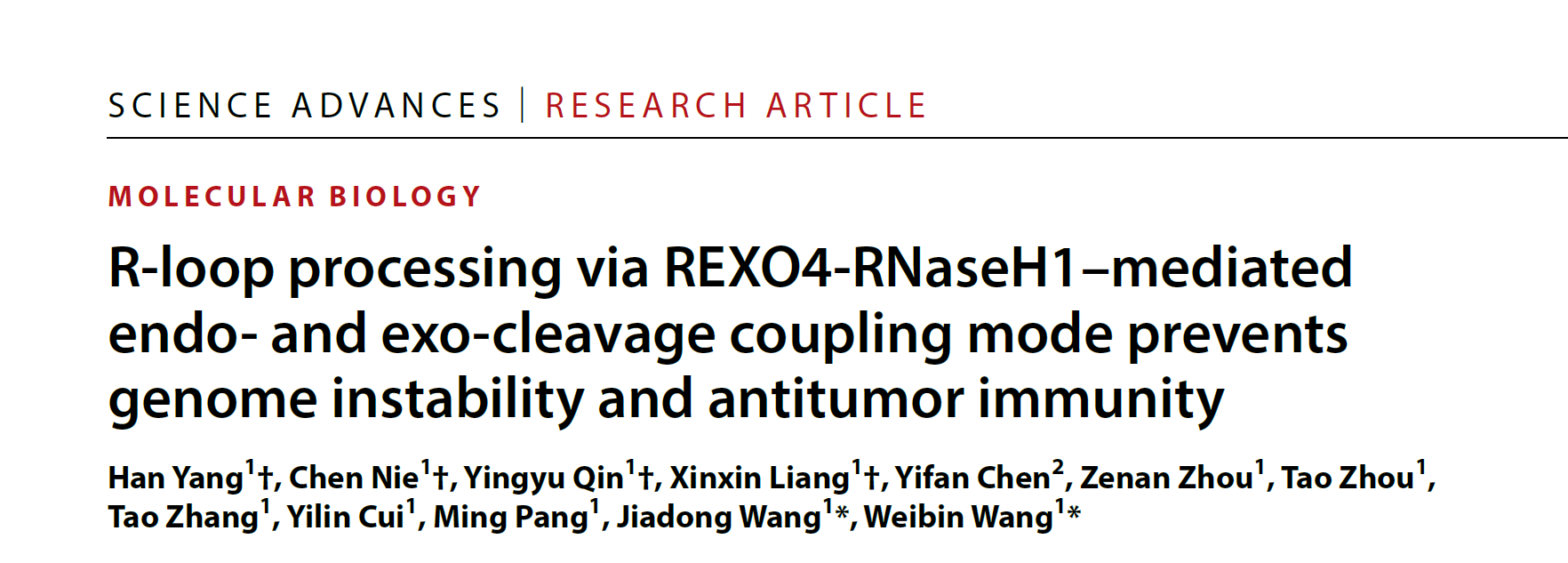 近日,北京大學基礎醫學院放射醫學系王維斌與王嘉東課題組合作在Science Advances上發表了題為R-loop processing via REXO4-RNaseH1-mediated endo- and exo-cleavage coupling mode prevents genome instability and antitumor immunity的研究論文