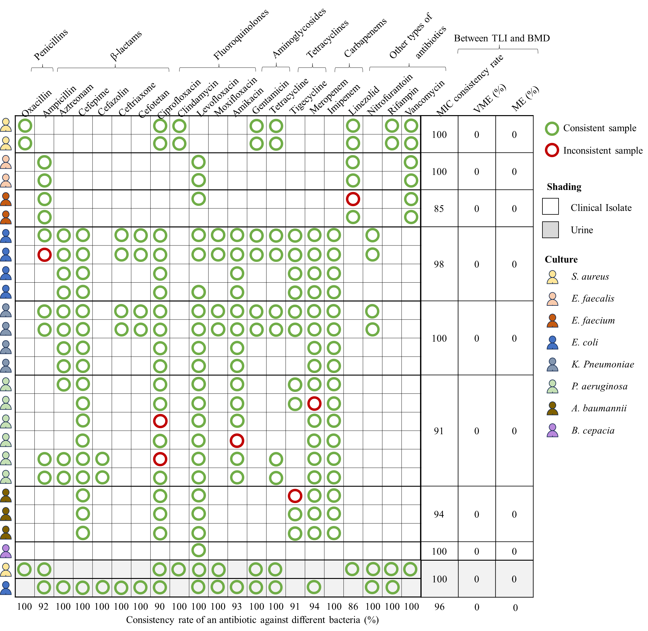 圖3 不同抗生素作用下臨床分離菌與尿液的TLI和BMD結(jié)果比較