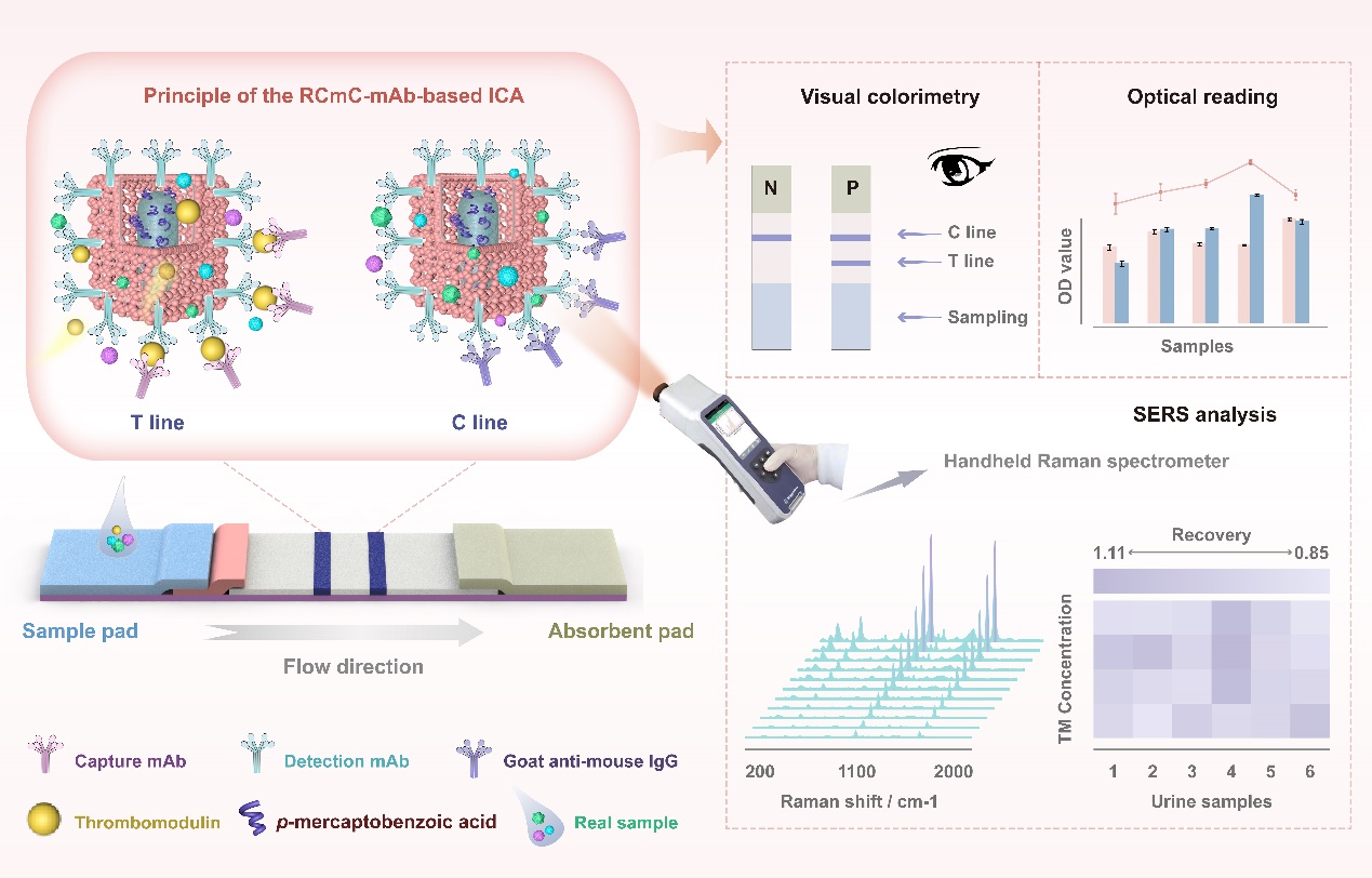 血栓調節蛋白(TM)是反映內皮功能障礙的關鍵生物標志物,但當前尚缺乏簡便且快速的檢測手段,例如免疫層析法(ICA)。基于常規金納米顆粒(AuNPs)的比色ICA因靈敏度不足,無法實現對痕量生物標志物的有效檢測。研究表明,表面增強拉曼光譜(SERS)技術具有超高靈敏度,可顯著提升ICA的傳感性能。然而,傳統等離子體納米顆粒的比表面積較小,限制了抗體結合位點,不利于檢測靈敏度的進一步提高。因此,開發兼具優異SERS活性與高效抗體偶聯能力的新型納米材料,對提高免疫層析分析性能具有重要意義。