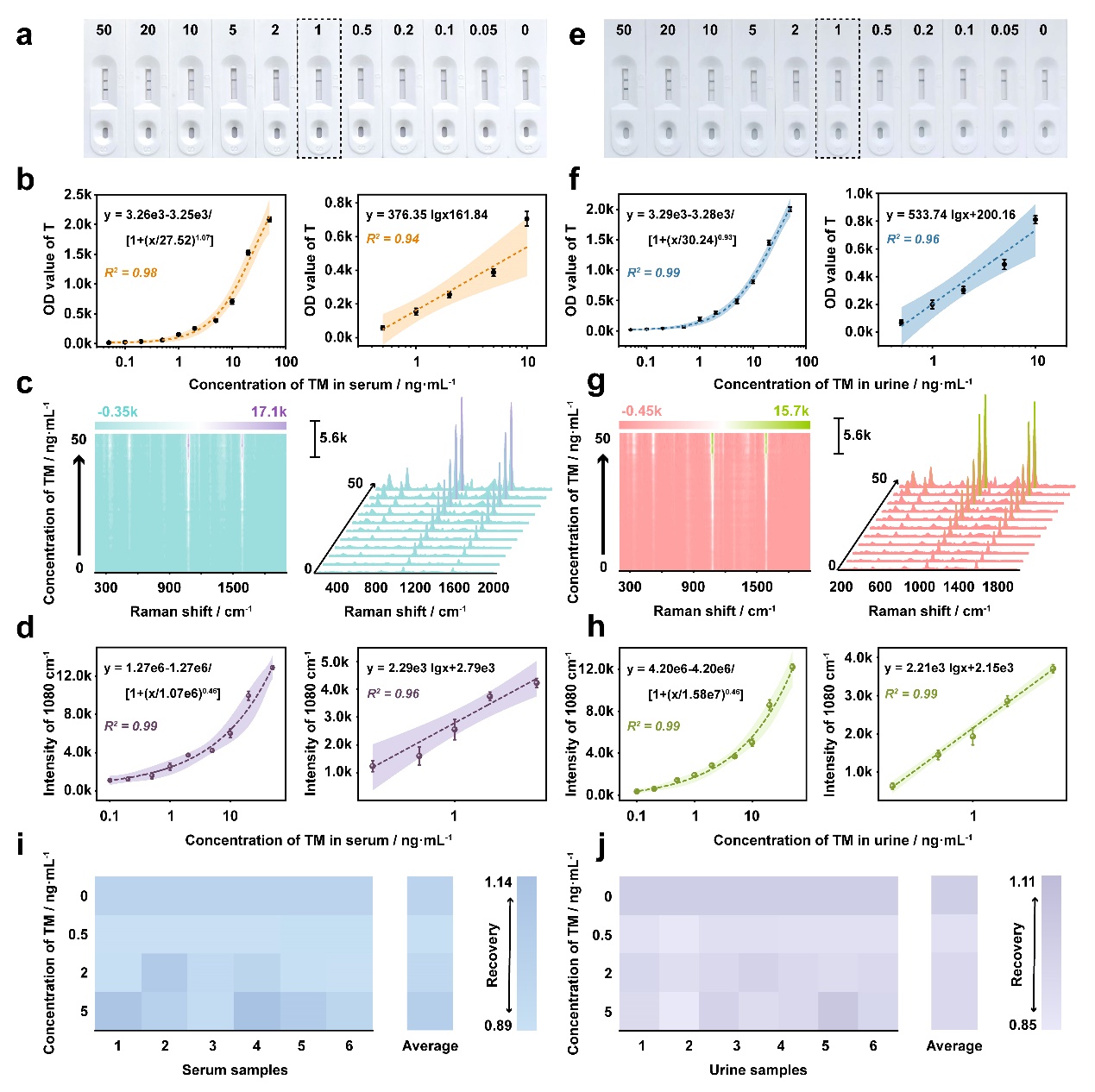 圖3 基于等離子體RCmC材料的三模式免疫層析方法用于實際樣本中TM的檢測性能表征