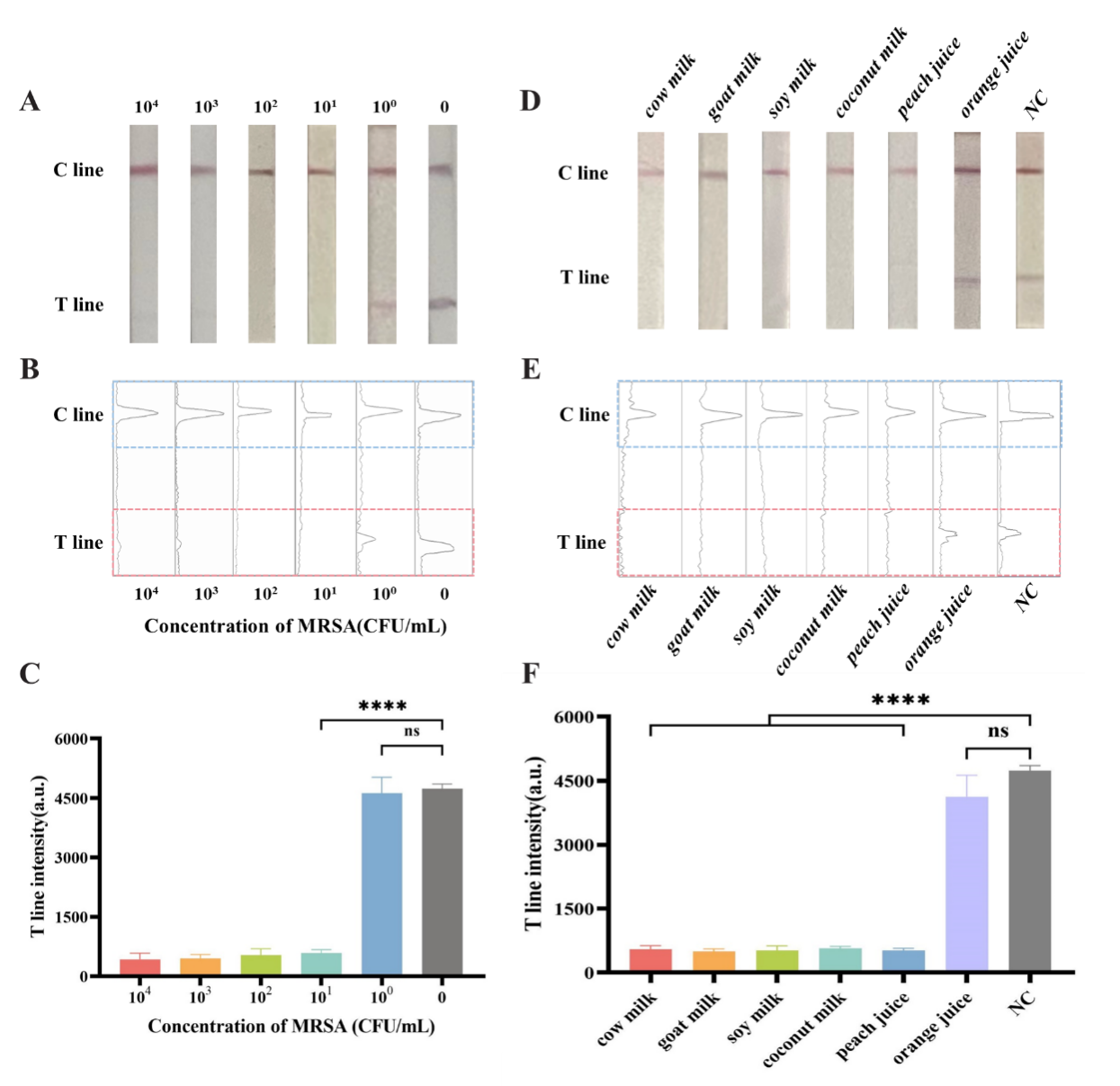 圖2?RPA-Cas12a-LFS方法可檢測牛奶、羊奶、豆奶、椰奶和桃汁等飲品中的MRSA