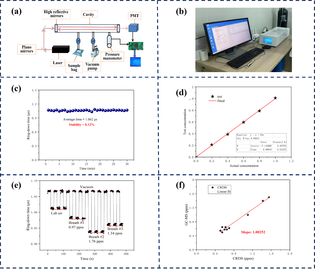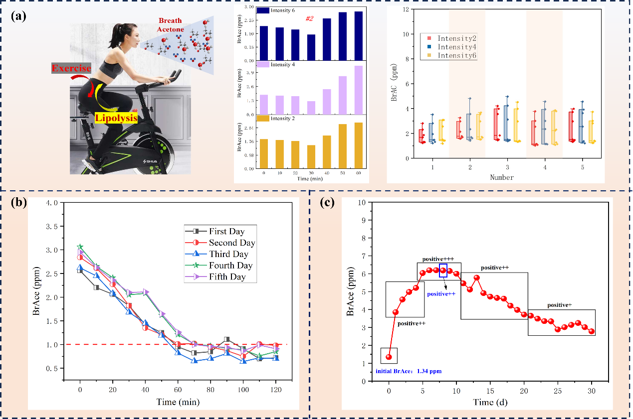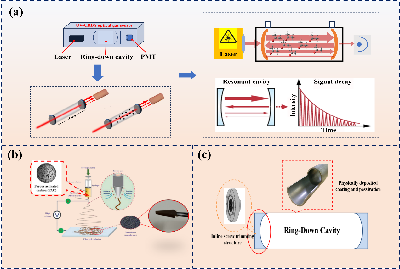 近日,蘇州醫工所姜琛昱研究員等,系統深入分析了光腔衰蕩光譜技術(Cavity Ringdown Spectroscopy,CRDS)在呼氣標記物高效數據獲取的影響因素,聚焦重要的呼氣標記物之一丙酮,將自主設計的輕量壓控諧振腔與新型多孔碳材料相結合,解決了呼氣標記物檢測中水蒸氣干擾和譜線展寬的兩大關鍵問題,研制出的CRDS呼出丙酮檢測系統。該系統衰蕩信號測量的相對標準偏差0.12%,響應時間1s,丙酮的檢測極限144 ppb,檢測線性度0.99921,在與檢測“金標準”GC-MS的對比測試中,相關系數1.0025,儀器總質量小于5.0 Kg,各性能指標顯著優于前期研究工作,并在運動管理、I型糖尿病監測和酮癥診斷等臨床代謝的相關應用中,完成了2000余例呼氣樣本高靈敏、高精準、實時在線檢測,不但為糖尿病的動態監測與管理提供了新思路,也為呼氣分析領域“探索新方法,開發新技術,研制新儀器,催生新應用”提供了可行的解決方案。