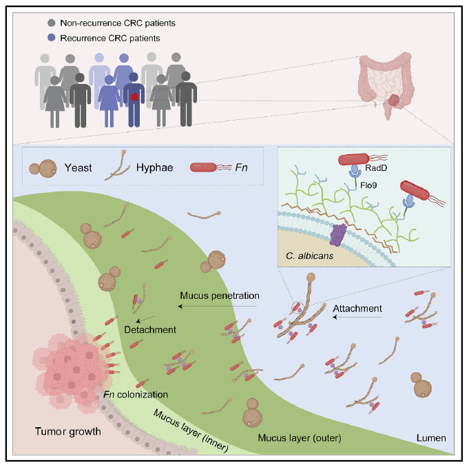 2026年2月26日,中國科學院上海藥物研究所陳昌斌團隊與上海交通大學醫學院附屬仁濟醫院房靜遠院士團隊及上海市免疫學研究所蘇冰團隊合作,共同在國際頂尖腫瘤學期刊Cancer Cell發表了題為“Candida albicans synergizes with Fusobacterium nucleatum in colorectal cancer progression via the Flo9-RadD interaction”的研究論文