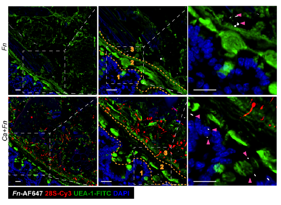 圖2.?熒光原位雜交顯示白念珠菌(Ca)幫助具核梭桿菌(Fn)通過黏液層進入上皮細胞。1.上皮層;2.黏膜內層;3.黏膜外層