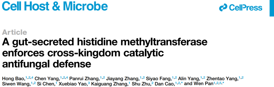 2025 年 12 月 17 日,該團隊在 Cell Host & Microbe 在線發表題為 “ A gut-secreted histidine methyltransferase enforces cross-kingdom catalytic antifungal defense ” 的研究論文,首次 揭示了一種由宿主分泌甲基化酶介導的跨界 ( cross-kingdom ) 抗真菌防御新模式