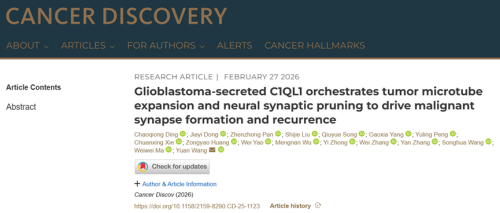 2月27日,四川大學華西醫院生物治療研究中心汪源/張燕研究員團隊,聯合清華大學/北京卓凱生物馬偉偉、江西科技師范大學王松華團隊,在腫瘤學國際頂級期刊Cancer Discovery(IF:33.3)在線發表題為“Glioblastoma-secreted C1QL1 orchestrate...