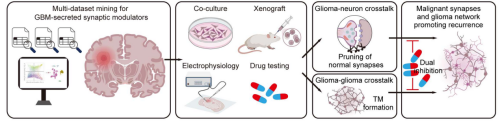 膠質母細胞瘤(GBM)是最常見、惡性程度最高的原發性腦腫瘤,患者預后極差。GBM呈現廣泛的浸潤性生長,浸潤區腫瘤細胞難以通過手術+放化療清除,是耐藥和復發的重要原因。近年的研究表明,GBM細胞在侵襲初始階段互不相連,但在定植后可生長出神經突樣的腫瘤微管(TM)相互連接形成腫瘤網絡,并與正常神經元形成功能突觸(惡性突觸),利用神經活動產生的電信號和旁分泌信號促進腫瘤生長、耐藥和復發。然而,浸潤區膠質瘤細胞如何通過腫瘤細胞間通訊促進TM和腫瘤網絡形成、如何與正常突觸競爭形成惡性突觸的分子機制尚不清楚,核心信號分子尚不明確,也缺乏有效的干預策略。