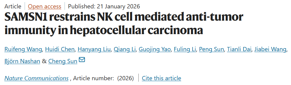 2026 年 2 月 21 日,中國科學技術大學生命科學與醫學部、免疫應答與免疫治療全國重點實驗室孫成教授團隊在《 Nature Communications 》發表論文“ SAMSN1 restrains NK cell mediated anti-tumor immunity in hepatocellular carcinoma”