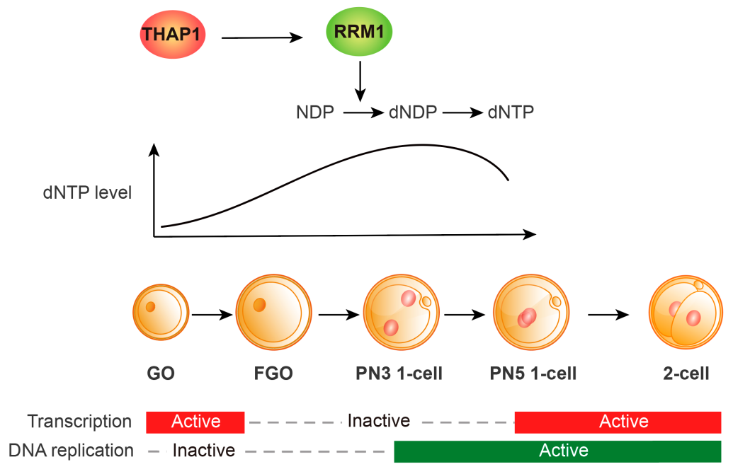 圖1. THAP1通過轉錄調控下游基因Rrm1,保障受精后第一個細胞周期所需dNTP供應,支持1細胞向2細胞轉變及合子基因組激活(ZGA)