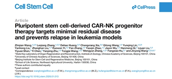 2026年2月24日,中國科學院動物研究所器官再生與智造全國重點實驗室王金勇研究組在干細胞領域專業刊物Cell Stem Cell以長文形式在線發表了題為“Pluripotent stem cell-derived CAR-NK progenitor therapy targets minimal residual disease and prevents relapse in leukemia models”的最新研究成果(圖1)。研究團隊開發出多能干細胞誘導來源的CAR?iNK祖(CAR-iNKP)細胞療法,實現體內大規模產生持續時間久的CAR-iNK細胞。傳統化療聯合低劑量、單一劑次的CAR-iNKP細胞輸注就可在人類B-ALL和T-ALL腫瘤動物模型上實現有效清除腫瘤微小殘留病灶,顯著降低腫瘤復發率。該項研究成果為傳統CAR-NK細胞療法面臨的體內存續時間短、長期療效不足等問題提供了新技術解決路徑。