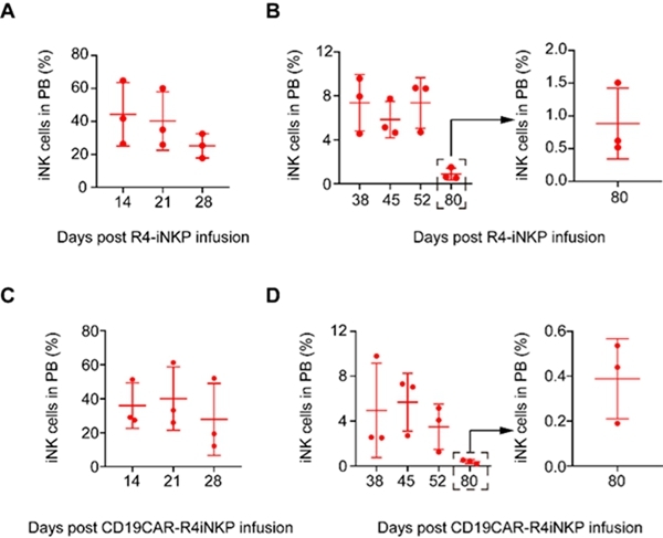 隨后,研究人員構建了表達CXCR4(CXCL12受體)的hPSC(R4-PSC)細胞系,并體外誘導其分化獲得具有骨髓歸巢能力的NK細胞種子—R4-iNKP細胞。通過尾靜脈輸注低劑量R4-iNKP細胞到IL15人源化小鼠(B-NDG hIL15小鼠,20萬R4-iNKP/只),細胞歸巢至骨髓,經7-10天在骨髓微環境中發育成熟為R4-iNK細胞,并進入血液循環系統和肝臟、淋巴結、脾臟、肺臟等多個實體臟器。令人鼓舞的是,這種體內再生策略實現iNK細胞在外周血液循環系統持續存在80天以上。表達CAR的R4-iNKP細胞同樣能體內產生CAR-R4iNK細胞,并且在外周血液循環系統中存在超過80天(圖2)。