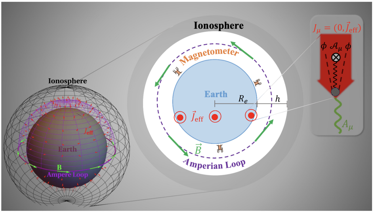 在研究中,作者提出:地球表面與電離層之間形成一個天然的電磁諧振腔。當超輕的微荷暗物質穿過地球磁場時,會與光子場耦合,產生一個振蕩的“等效電流”,進而激發一個可在地表探測的交變磁場信號,如圖1所示。該信號具有獨特的1/m?2質量依賴關系,因此在極輕質量區間(低于10?14eV)靈敏度顯著提升。