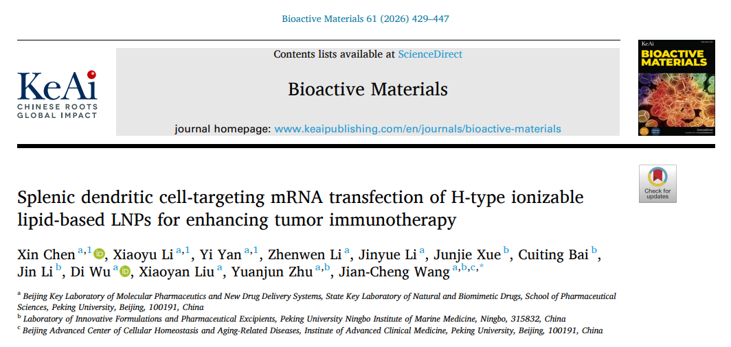 ? ? ?2026 年 2 月 18 日,北京大學教授、 寧波海洋藥物研究院 高端藥物制劑與藥用材料研究中心首席科學家王 堅 成團隊在國際學術期刊 Bioactive Materials 在線發表了題目為 Splenic dendritic cell-targeting mRNA transfection of H-type ionizable lipid-based LNPs for enhancing tumor immunotherapy 的 最新研究成果 ,該研究開發了一類基于 H 結構的可電離脂質,以該脂質制備的 LNPs 可實現 mRNA 藥物在體內脾臟 DC 細 胞的靶向性遞送,為腫瘤 mRNA 疫苗的開發提供了新策略