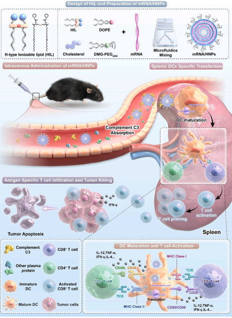 近些年來,mRNA療法在諸多疾病治療領域已成為一種革命性的治療手段。其中,以脂質納米顆粒(Lipid Nanoparticles, LNPs)作為mRNA遞送載體已在感染性疾病(如COVID-19、RSV等)的預防中取得顯著成功。然而,在腫瘤免疫治療領域,如何將mRNA精準遞送至脾臟這一關鍵免疫器官,特別是靶向其中的樹突狀細胞(DC),以高效激活機體特異性抗腫瘤免疫應答,仍是一個亟待解決的挑戰。